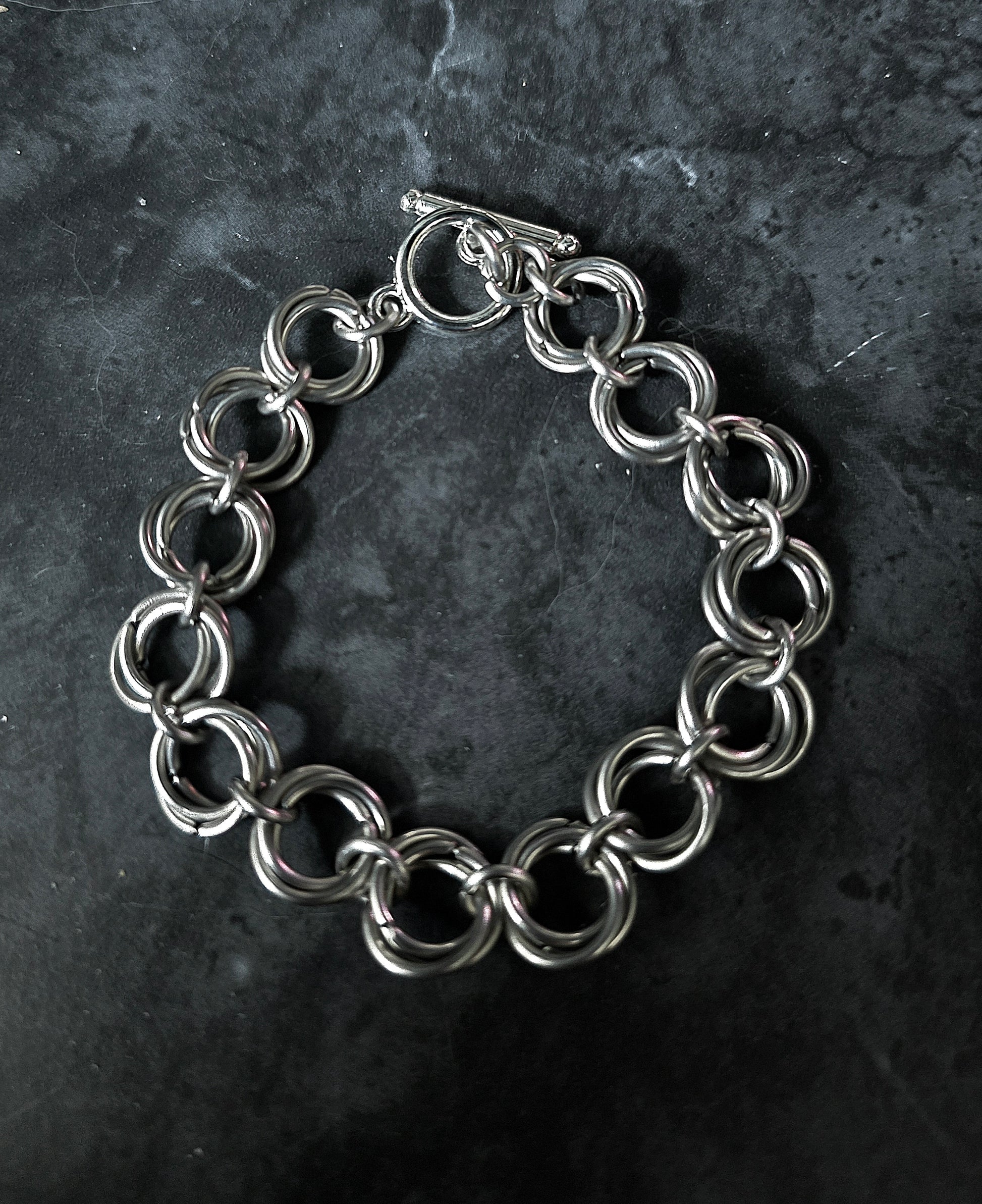 Crafted by hand, each steel rivet is meticulously wired and cut, coming together to form an intricately designed Boxchain bracelet. Process takes about 1-2 weeks to make before shipping to their new home.